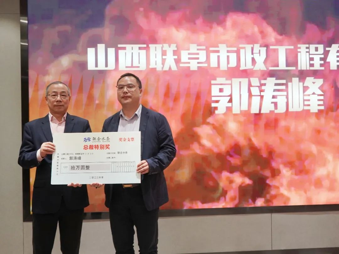 俞總作總結發言 會上,俞總向大家分析了當前國內外經濟形勢,分析了行業趨勢,提出在新的一年,聯合水務將開啟新的發展征程。2023年,我們將面臨新的環境要求,我們要充分發揮新的平臺優勢,緊緊圍繞“主業清晰、業績增長、運營高效”的企業價值目標,勵精圖治,高質量提升存量業務,切實完成業績目標,不斷提升管理效率,運營好現有傳統水務業務。同時,要奮發有為,高質量發展增量業務,開發優質項目和戰略業務。我們要聚焦主業,強化科技支撐,輕重業務結合,國內與海外發展;我們也將研究并審慎評估“水務+”新興領域,充實業務版塊,增強管理團隊。 最后,俞總強調,我們要堅持“團結、誠信、拼搏、共贏”的企業精神,在2023年的工作中勵精圖治,奮發有為,為開啟聯合水務發展新征程、實現聯合水務高質量發展而努力奮斗。 會議為建設管理中心副總經理兼任山西聯卓市政工程有限公司總經理郭濤峰頒發了“2022年度總裁特別獎”。2022年,郭總兢兢業業、勤懇奉獻,率領聯卓公司建設團隊出色完成了業績任務,為提升聯合水務經營業績和項目建設做出了貢獻。