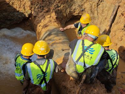 不懼“烤”驗,隨時出擊。7月5日,永安大道DN600主管道突發爆管,咸寧思源水務接到報修電話,立即組織人員趕赴現場,爭分奪秒開展管網搶修作業。搶修人員第一時間設置安全警示標識,在確定好漏點位置、做好現場保護、關閥停水后,頂著36℃高溫,有條不紊展開搶修工作。經過抽水、挖掘、清理,管道破損位置露出水面。在狹長窄小的管溝中作業,轉身接零部件都得小心翼翼,搶修人員身上的衣服濕了干、干了濕,似火的烈日曬得他們皮膚滾燙,藿香正氣水的刺鼻味道充斥在他們的胸腔,有人笑稱:“藿香正氣水都喝飽了。”哪怕在這樣的工作環境下,他們也沒有一個人抱怨,沒有一個人偷懶,用八多個小時的堅守換來了居民在炎炎夏日里的用水安全。