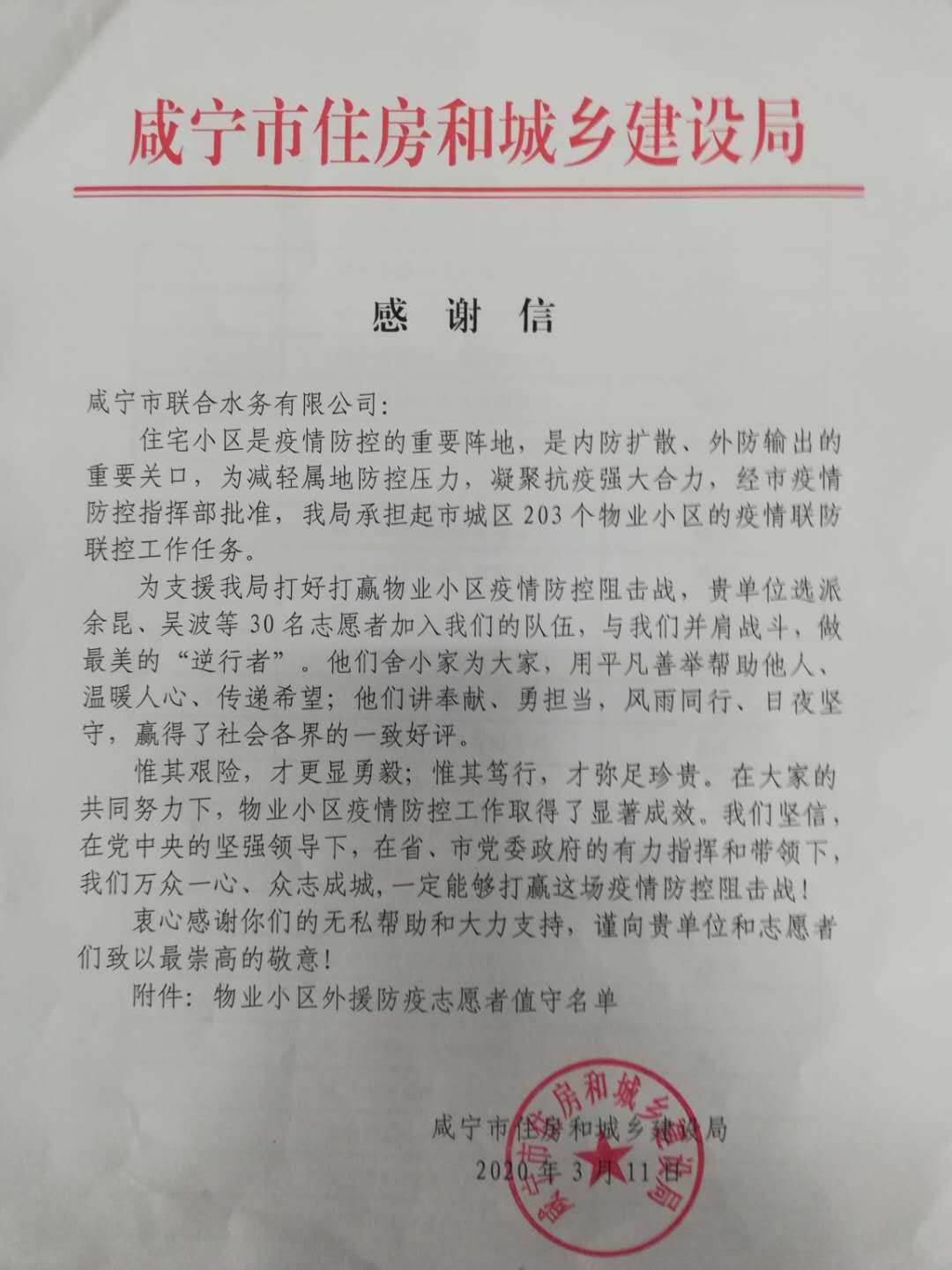 “為支援我局打好打贏物業小區疫情防控阻擊戰,貴單位派出李暉、陳治坤、余昆等33余名青年職工加入我們的隊伍,與我們并肩作戰,做最美的‘逆行者’。他們舍小家為大家,用平凡善舉幫助他人、溫暖人心、傳遞希望;他們講奉獻、勇擔當,風雨同行、日夜堅守,贏得了社會各界的一致好評……”3月11日,咸寧聯合水務有限公司在全面復工第一天,收到一封來自市住建局的感謝信。信中市住建局對咸寧聯合水務志愿者們無私的奉獻和大力支持,表示高度肯定和崇高的敬意。寶貴的感謝信將激勵咸寧聯合水務更加堅定信心、自我加壓,堅守崗位,盡職履責,抗擊疫情。
