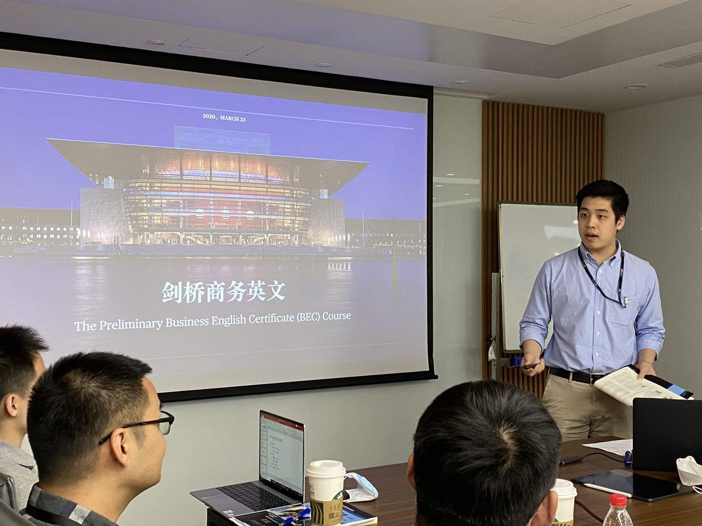 本次培訓的最后環節為《劍橋商務英語》系列培訓課程的開班第一課,全程由孟加拉項目公司副總經理俞世晉主講,并由海外事業部項目投資經理裴揚、葛芷函和孟加拉項目公司合同造價工程師丁華僑等擔任助教。在俞總及三位助教的多樣化教學的帶動下,全場氣氛活躍,大家深感收益匪淺,并對未來的英語學習充滿信心!