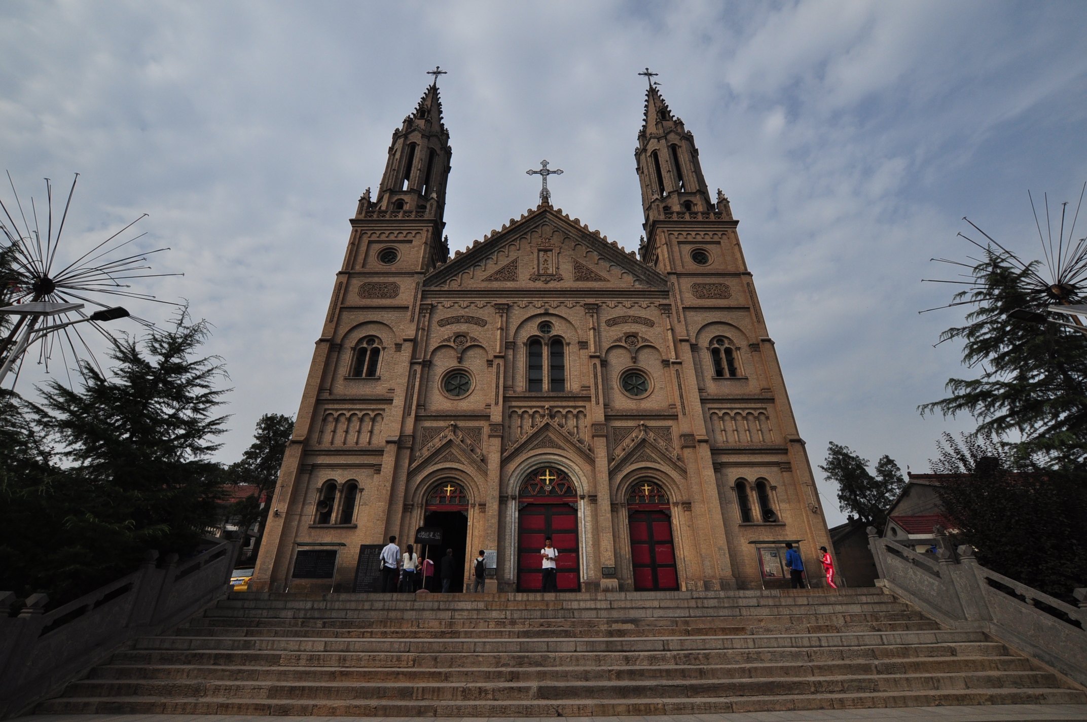 圖1:教堂外景 新絳天主教堂位于新絳縣的一座大型天主教堂,天主教新絳(運城)教區(qū)的主教座堂,位于新絳縣城北街頂端的高崖上。新絳是山西省最早傳入天主教的地方,1620年(明朝萬歷四十八年),意大利神甫艾儒略來到絳州,建立山西省第一座天主教堂。1935年,梵蒂岡教廷宣布成立新絳教區(qū),是天主教在山西的8個教區(qū)之一,管轄附近22個縣的天主教堂。1937年,荷蘭神父孔昭明在此建造了一座哥特式建筑風(fēng)格的大型主教座堂,于1943年落成。其建筑規(guī)模在全中國的哥特式教堂中屬于較大的一座,與青島、上海、廣州教堂并稱全國四大天主教堂。