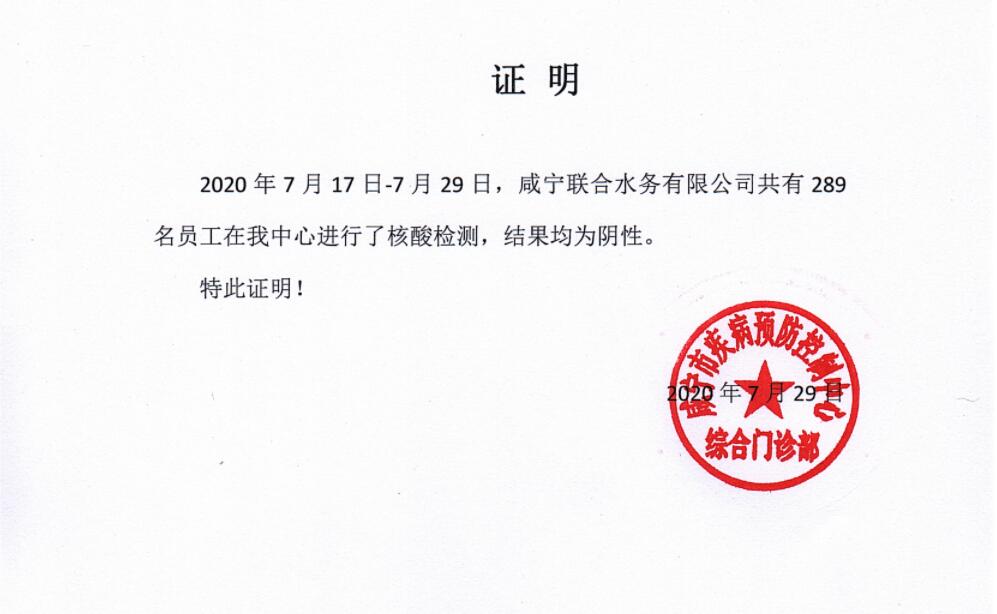 圖2:咸寧聯(lián)合水務(wù)員工檢測結(jié)果均為陰性