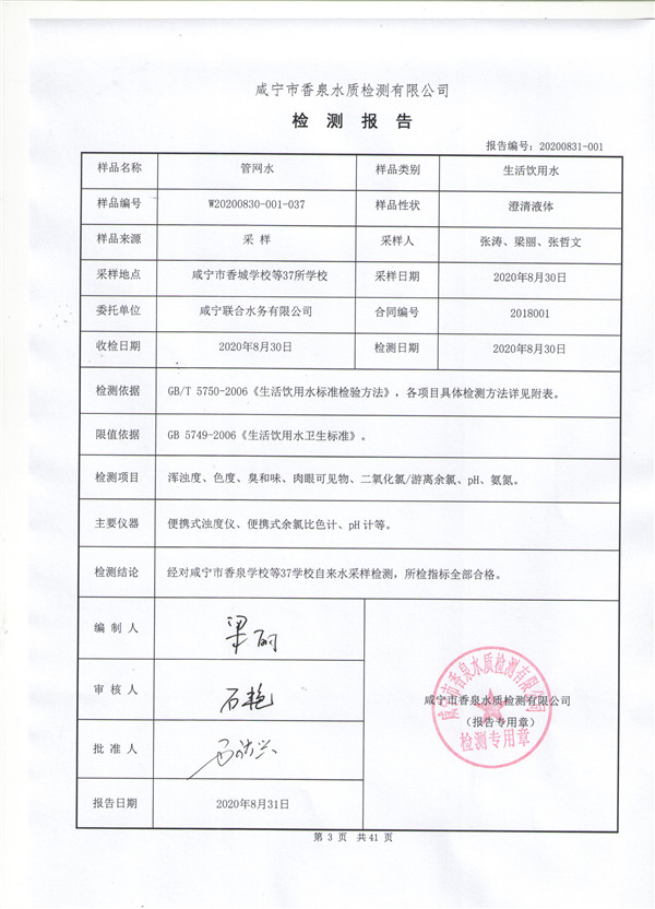 咸寧城區(qū)開學(xué)季水質(zhì)“檢測報(bào)告”出爐——咸寧聯(lián)合水務(wù)對城區(qū)37所學(xué)校開展水質(zhì)檢測服務(wù) | ||